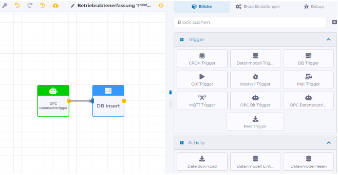 To design a workflow, start by selecting a trigger from the "Blocks" tab in the "Trigger" category and dragging it onto the design canvas using drag & drop. For each selected block, the available settings for configuration are displayed on the "Block Settings" tab. Then, for example, a block from the "Action" category can be selected and added to the workflow. Connecting the blocks is done by dragging a connection arrow using drag & drop. Clicking the