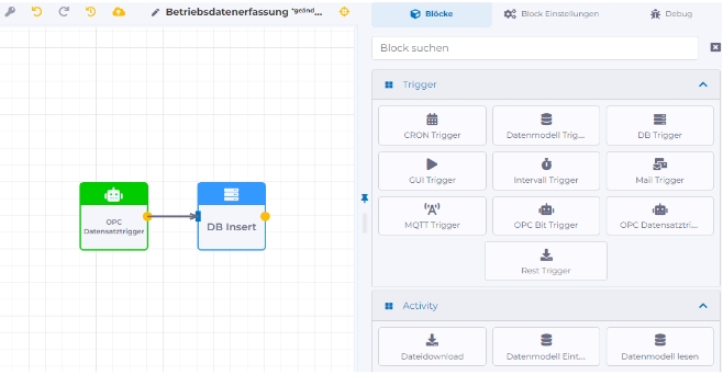 Below is an exemplary workflow that uses an OPC data set trigger to write an OPC server data point to a database when its value changes.